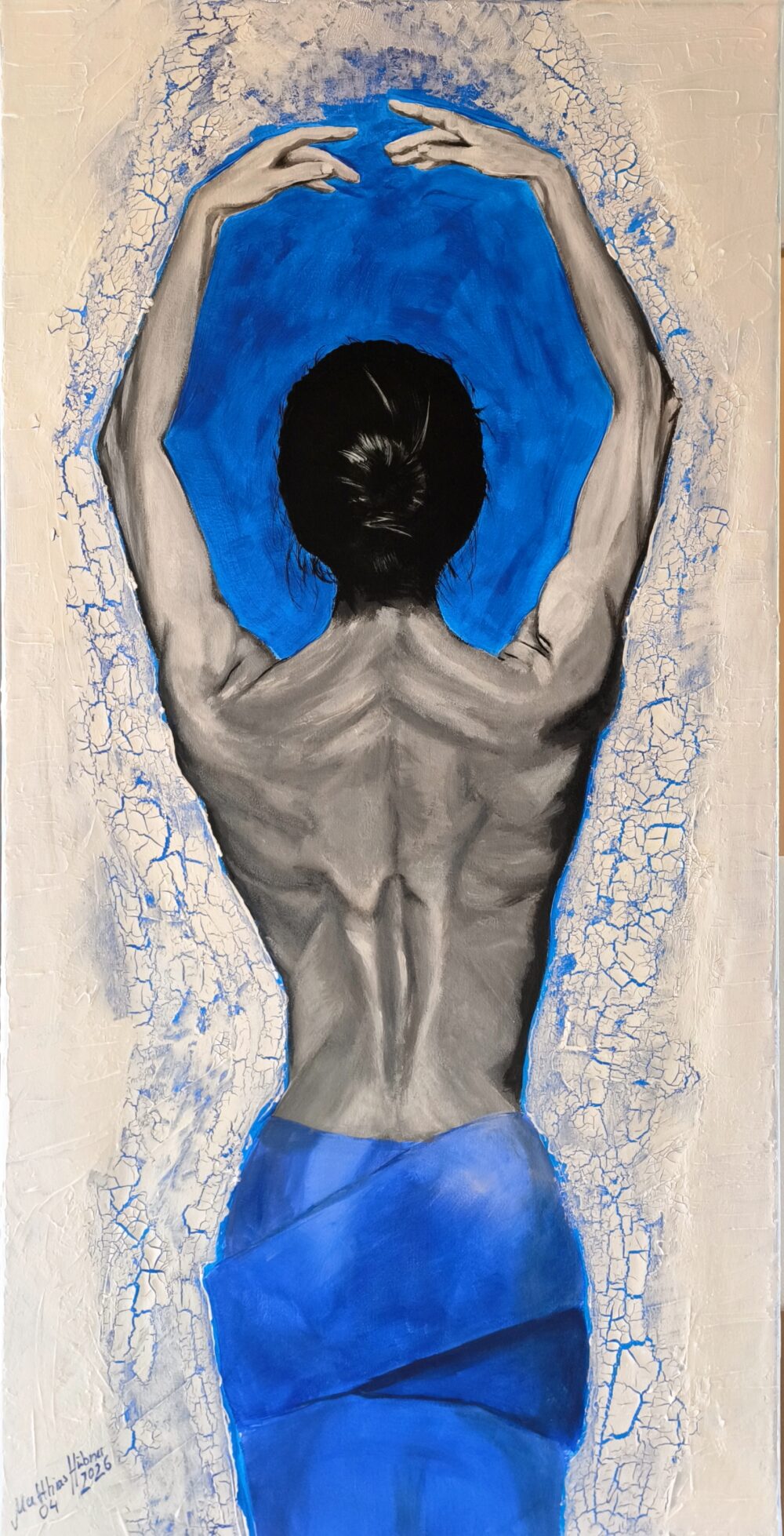 Die monochrome Lichtführung arbeitet die Muskulaturskulptural aus der Leinwand heraus, während ein intensiv blaues Tuch die untere Körperpartie umschließt. Das Motiv ist eingebettet in einen hellen Fond mit tiefen Craquelé-Strukturen, durch deren Risse das Blau des Untergrunds hindurchschimmert. In der Tiefe der Pigmente verbergen sich UV-reaktive Akzente, die dem Werk unter Schwarzlicht eine zusätzliche, leuchtende Dimension verleihen.