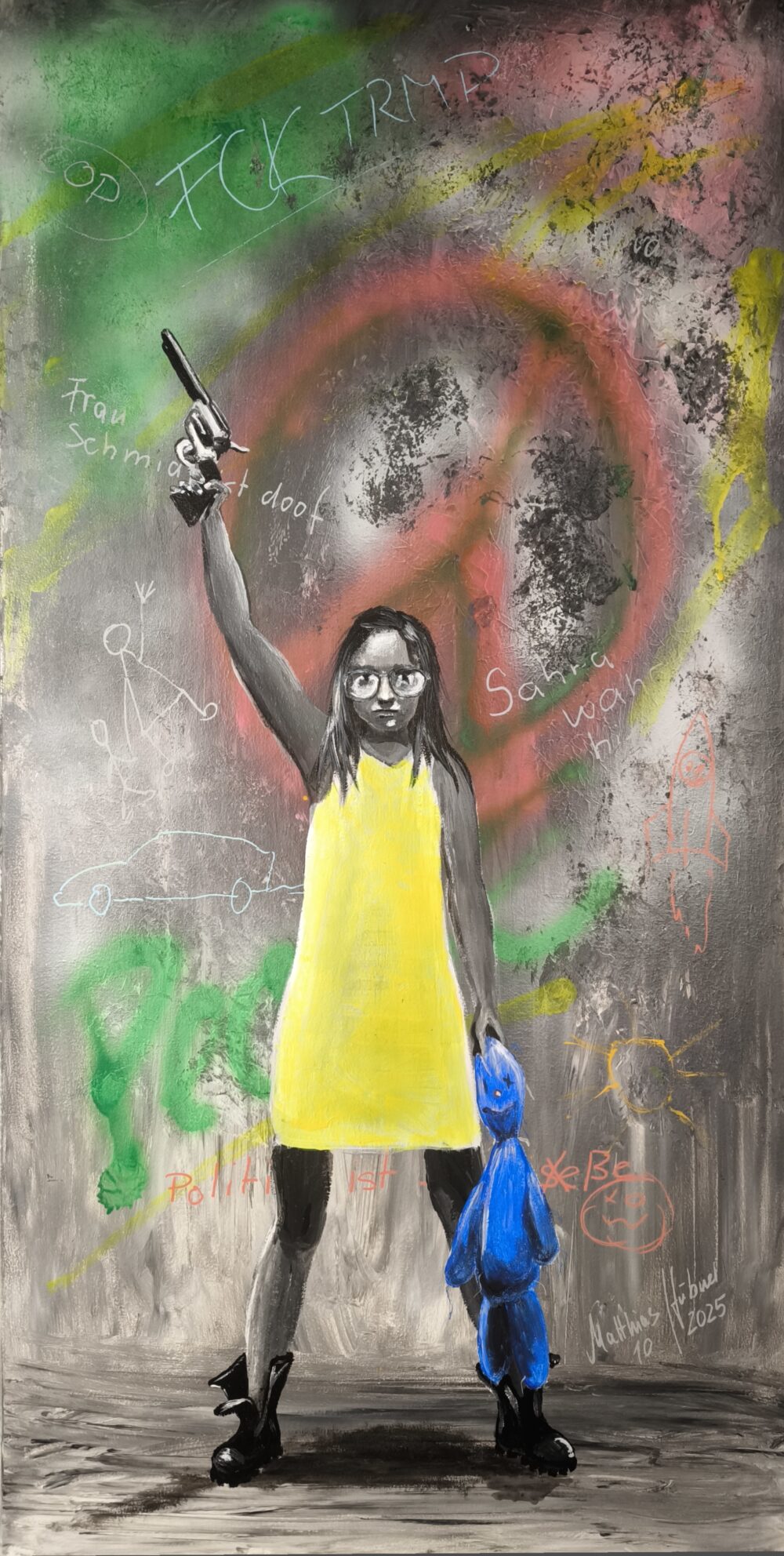 Ein Mädchen steht frontal vor dem Betrachter, mit erhobenem Arm und ernster Miene. In ihrer Hand eine Pistole, in der anderen ein blaues Stofftier – ein verstörend poetisches Sinnbild für den Konflikt zwischen Unschuld und Gewalt. Hinter ihr prangt ein großflächiges Peace-Zeichen, umgeben von grellen Farbspuren, Graffiti, Kritzeleien und Parolen, die Wut, Angst und Gesellschaftskritik sichtbar machen.